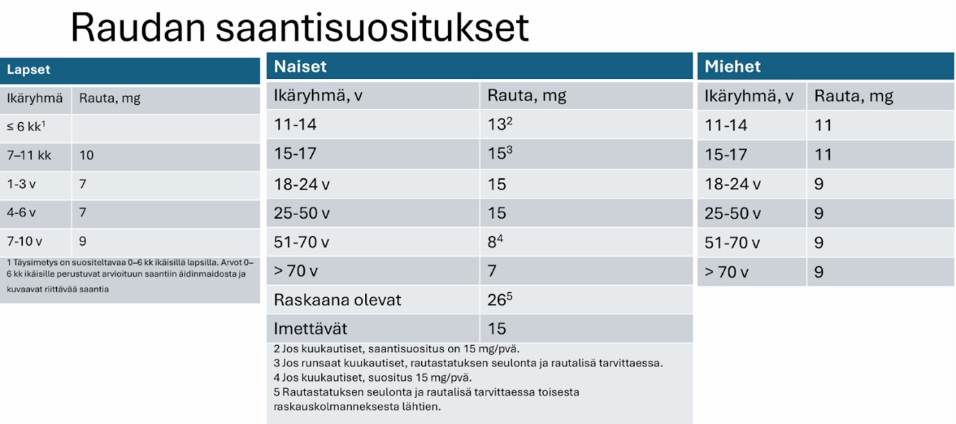 - Raudan tarve on yksilöllinen: työikäiset naiset ~15 mg/vrk, miehet 9 mg/vrk; vaihdevuosien jälkeen naisilla 7–8 mg/vrk.